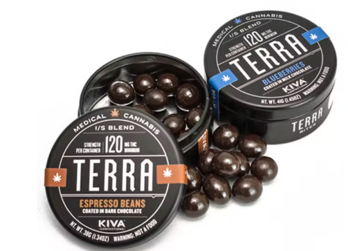 BLUEBERRY FLAVOR- MILK CHOCOLATE THC 100MG THC PER BITE 5 Blueberry Terra Bites are the latest innovation in our line of best-selling Terra Bites. Using a traditional 24-hour panning process, dried US-grown blueberries are dusted with cocoa powder and finished with a generous coating of delicious milk chocolate. Each 5MG bite is polished to sweet, tart, irresistible, perfection. Ingredients: Milk Chocolate (Sugar, Cocoa Butter, Milk, Unsweetened Chocolate, Lecithin (Sunflower and/or Soya), Vanilla), Cultivated Blueberry (Sugar, Blueberry, Sunflower Oil), Confectioner’s Glaze, Cannabis Extract, Cocoa Powder, Natural Flavor, Citric Acid. Allergy Warning: Contains Milk. May Contain Traces of Nuts. ESPRESSO FLAVOR – DARK CHOCOLATE THC 100MG THC PER BITE 5 KIVA Terra Bites are crafted from micro-roasted Tanzanian coffee beans and coated in Kiva Dark Chocolate. With 5MG of THC per bite, Terra offers dosing that is as convenient as it is delicious. The reclosable container makes it easy to enjoy a little now, and with 100mg THC in each tin, a little later, too. All Natural Ingredients: Semisweet Chocolate (Sugar, Unsweetened Chocolate, Cocoa Butter, Potassium Carbonate, Lecithin (Sunflower and/or Soya), Vanilla), Espresso Bean, Cannabis Extract, Confectioner’s Glaze, Cocoa Powder, Natural Flavor. Allergy Warning: May Contain Traces of Nuts and Milk. SEA SALT CARAMEL – FLAVOR MILK CHOCOLATE THC 100MG THC PER BITE 5 Rich and smooth caramel centers coated in our creamy milk chocolate and sprinkled with Pacific sea salt. These bites have a sweet, buttery flavor that finish with a salty kick. Ingredients: Milk Chocolate (Sugar, Cocoa Butter, Milk, Cocoa Mass, Sunflower Lecithin, Vanilla), Tapioca Syrup, Sugar, Cream (milk), Palm Kernel Oil, Sea Salt, Gum Arabic, Cannabis Extract, Natural Flavors, Confectioner’s Glaze, Sucrose, Glucose Syrup. Allergy Warning: Contains milk. May contain nuts, soy and gluten.